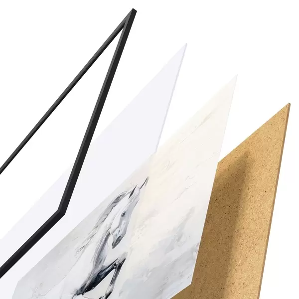 El póster consta de marco, plexiglás, imagen impresa y soporte de aglomerado. El póster puede colgarse inmediatamente en la pared gracias a los soportes de la parte posterior.