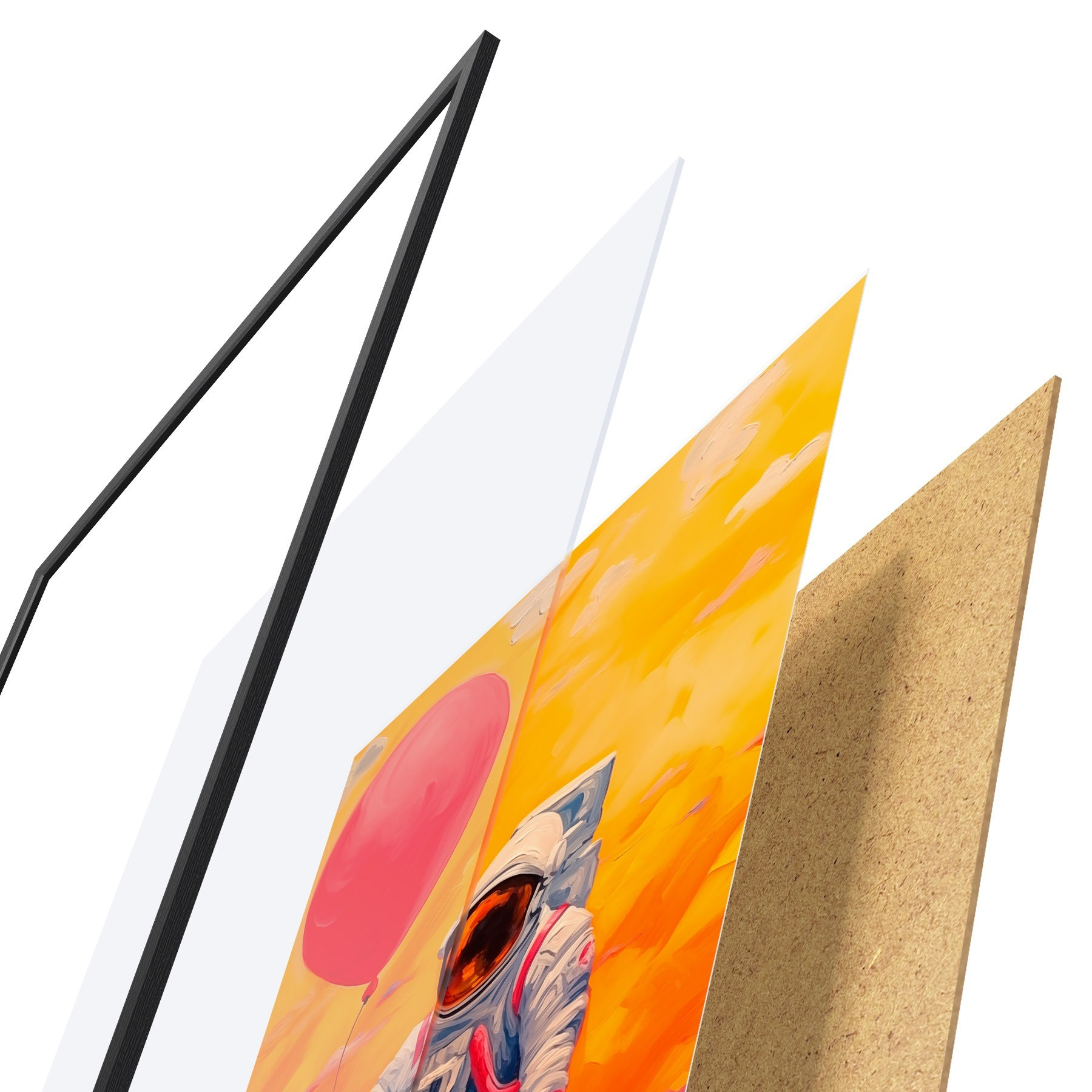 El póster consta de marco, plexiglás, imagen impresa y soporte de aglomerado. El póster puede colgarse inmediatamente en la pared gracias a los soportes de la parte posterior.