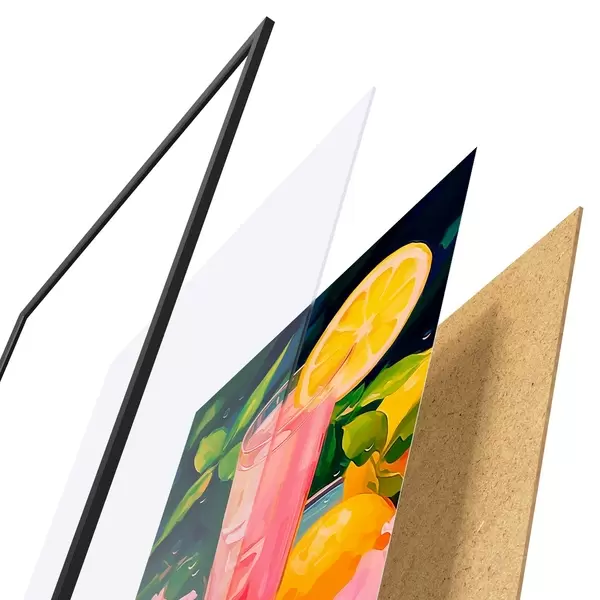 El póster consta de marco, plexiglás, imagen impresa y soporte de aglomerado. El póster puede colgarse inmediatamente en la pared gracias a los soportes de la parte posterior.