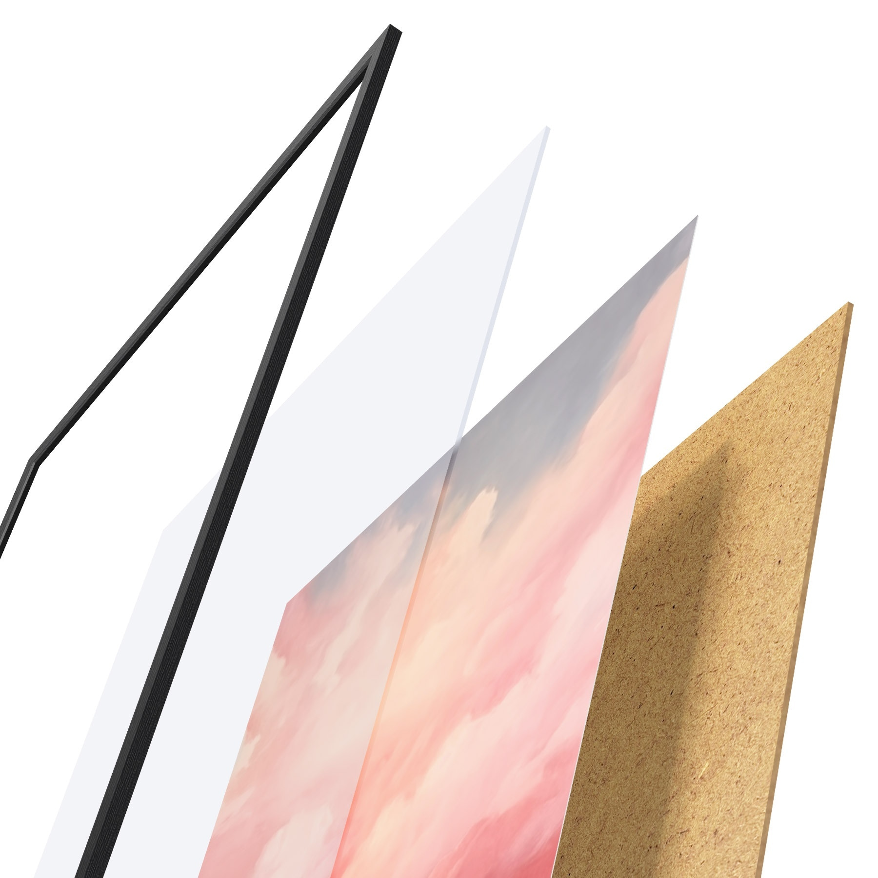 El póster consta de marco, plexiglás, imagen impresa y soporte de aglomerado. El póster puede colgarse inmediatamente en la pared gracias a los soportes de la parte posterior.
