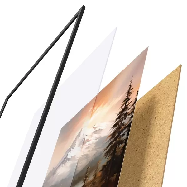 El póster consta de marco, plexiglás, imagen impresa y soporte de aglomerado. El póster puede colgarse inmediatamente en la pared gracias a los soportes de la parte posterior.