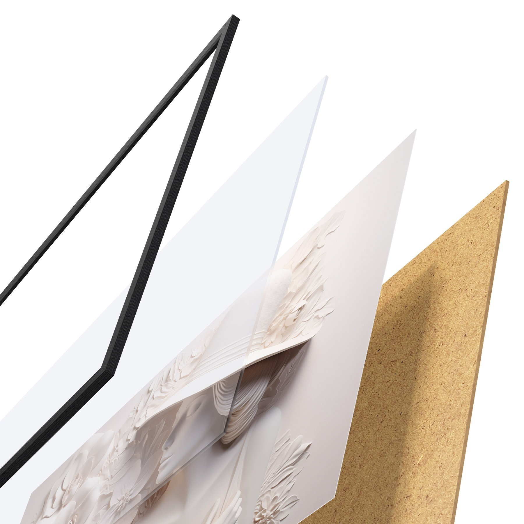 El póster consta de marco, plexiglás, imagen impresa y soporte de aglomerado. El póster puede colgarse inmediatamente en la pared gracias a los soportes de la parte posterior.