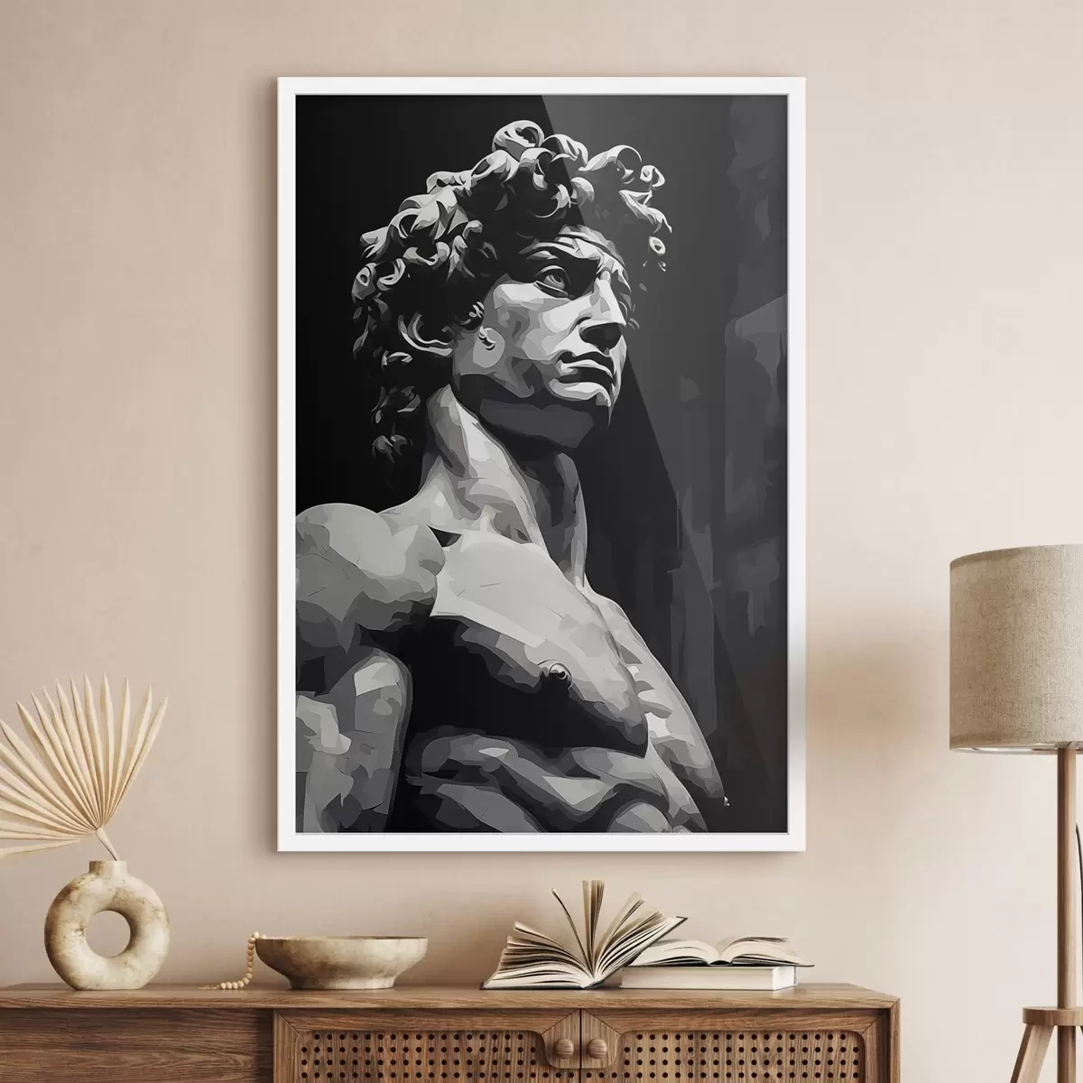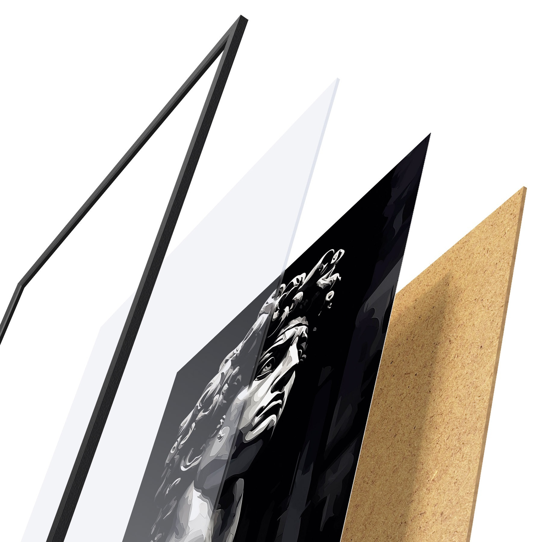 El póster consta de marco, plexiglás, imagen impresa y soporte de aglomerado. El póster puede colgarse inmediatamente en la pared gracias a los soportes de la parte posterior.