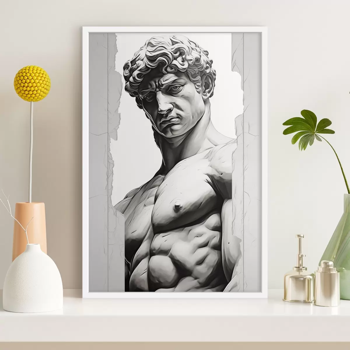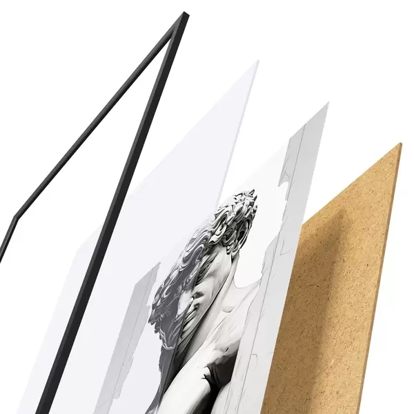 El póster consta de marco, plexiglás, imagen impresa y soporte de aglomerado. El póster puede colgarse inmediatamente en la pared gracias a los soportes de la parte posterior.