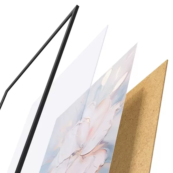 El póster consta de marco, plexiglás, imagen impresa y soporte de aglomerado. El póster puede colgarse inmediatamente en la pared gracias a los soportes de la parte posterior.