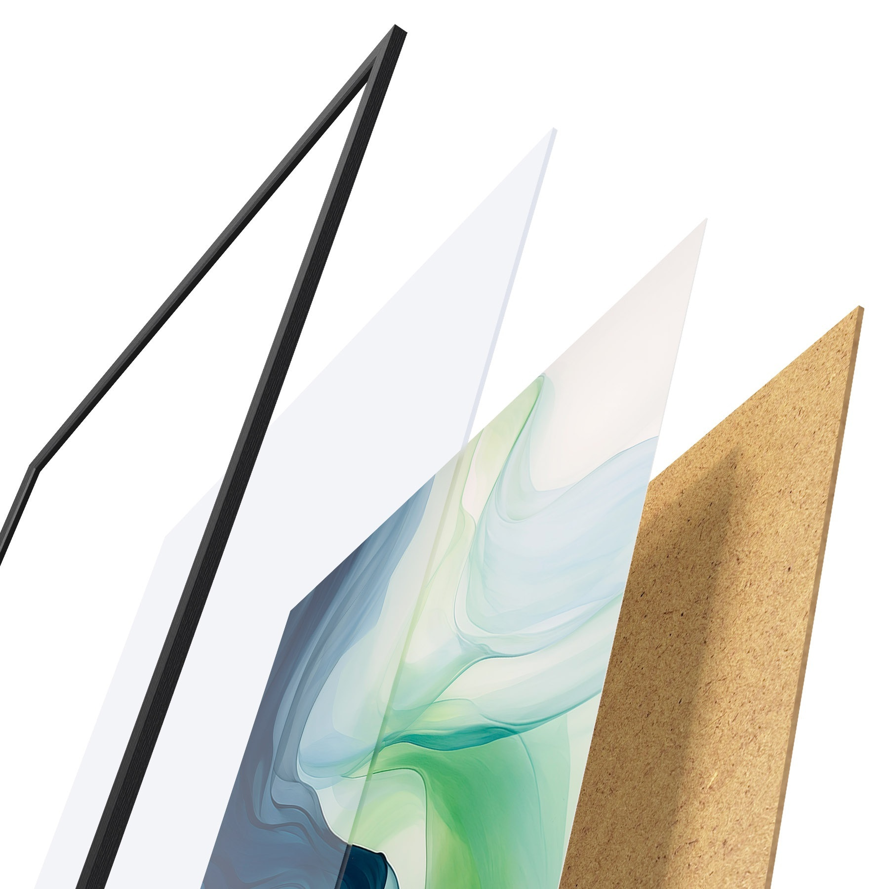 El póster consta de marco, plexiglás, imagen impresa y soporte de aglomerado. El póster puede colgarse inmediatamente en la pared gracias a los soportes de la parte posterior.