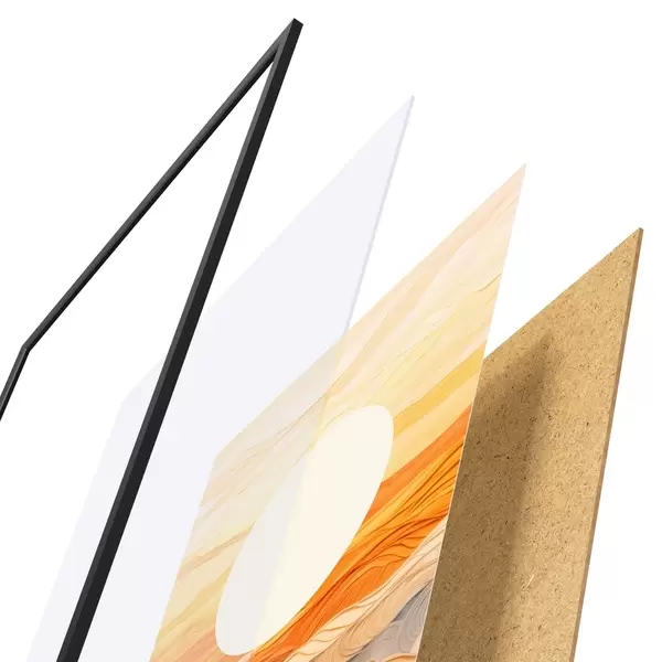 El póster consta de marco, plexiglás, imagen impresa y soporte de aglomerado. El póster puede colgarse inmediatamente en la pared gracias a los soportes de la parte posterior.