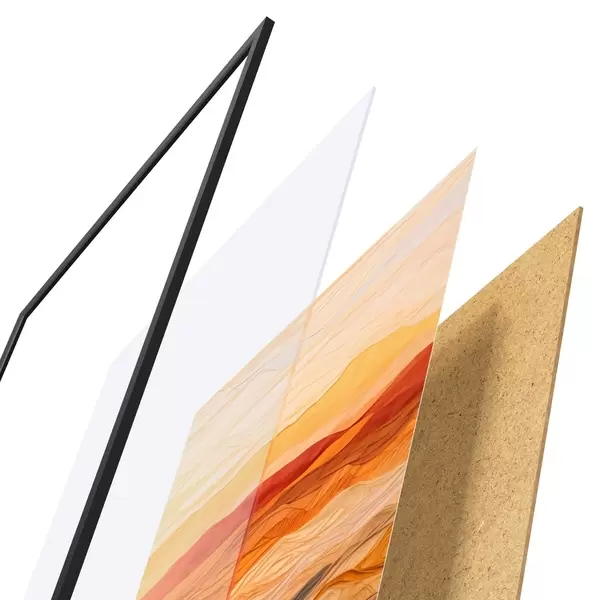 El póster consta de marco, plexiglás, imagen impresa y soporte de aglomerado. El póster puede colgarse inmediatamente en la pared gracias a los soportes de la parte posterior.