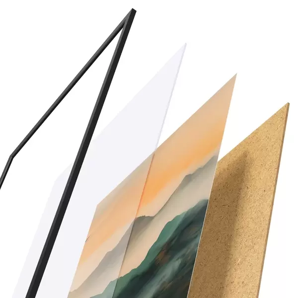 El póster consta de marco, plexiglás, imagen impresa y soporte de aglomerado. El póster puede colgarse inmediatamente en la pared gracias a los soportes de la parte posterior.
