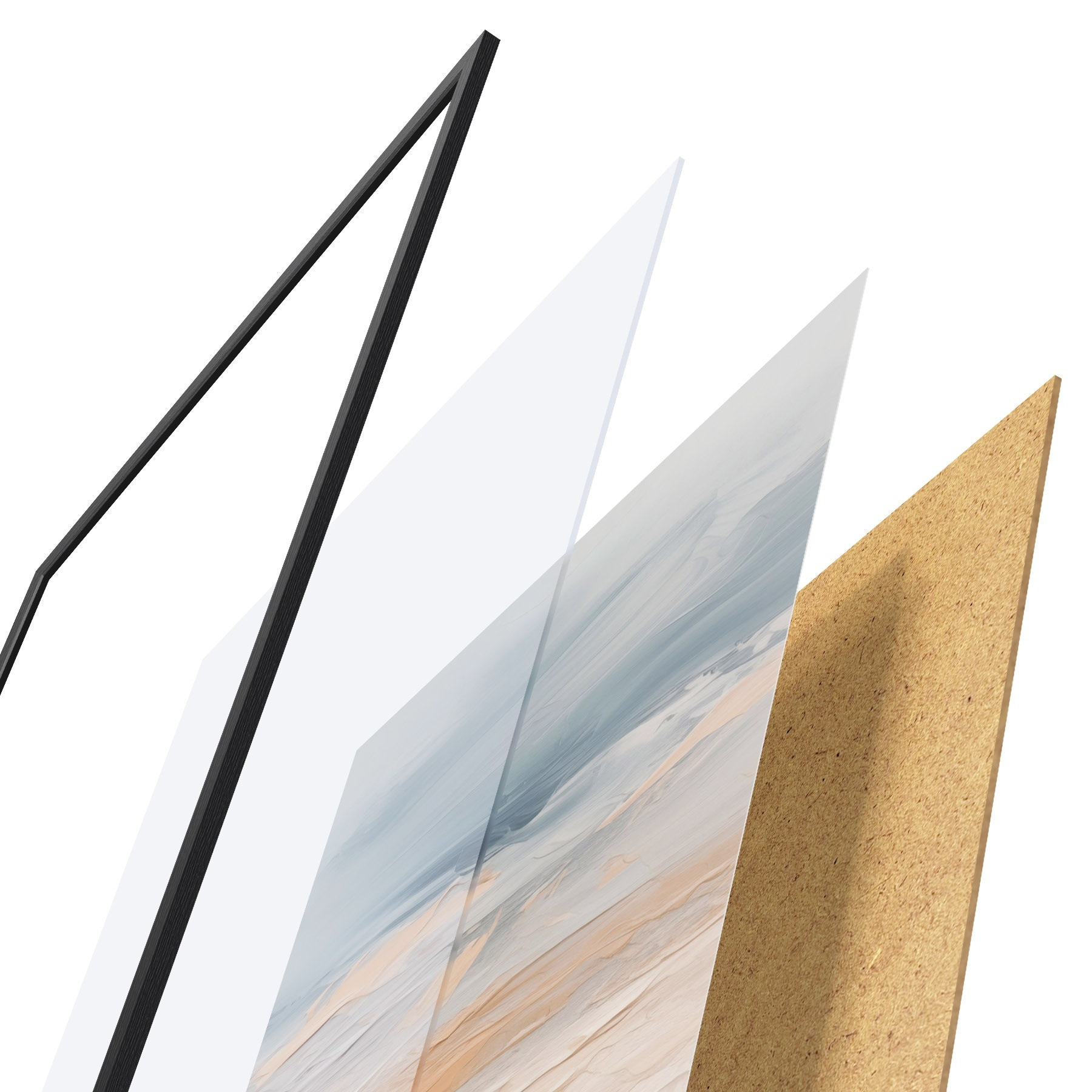 El póster consta de marco, plexiglás, imagen impresa y soporte de aglomerado. El póster puede colgarse inmediatamente en la pared gracias a los soportes de la parte posterior.