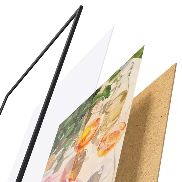 El póster consta de marco, plexiglás, imagen impresa y soporte de aglomerado. El póster puede colgarse inmediatamente en la pared gracias a los soportes de la parte posterior.
