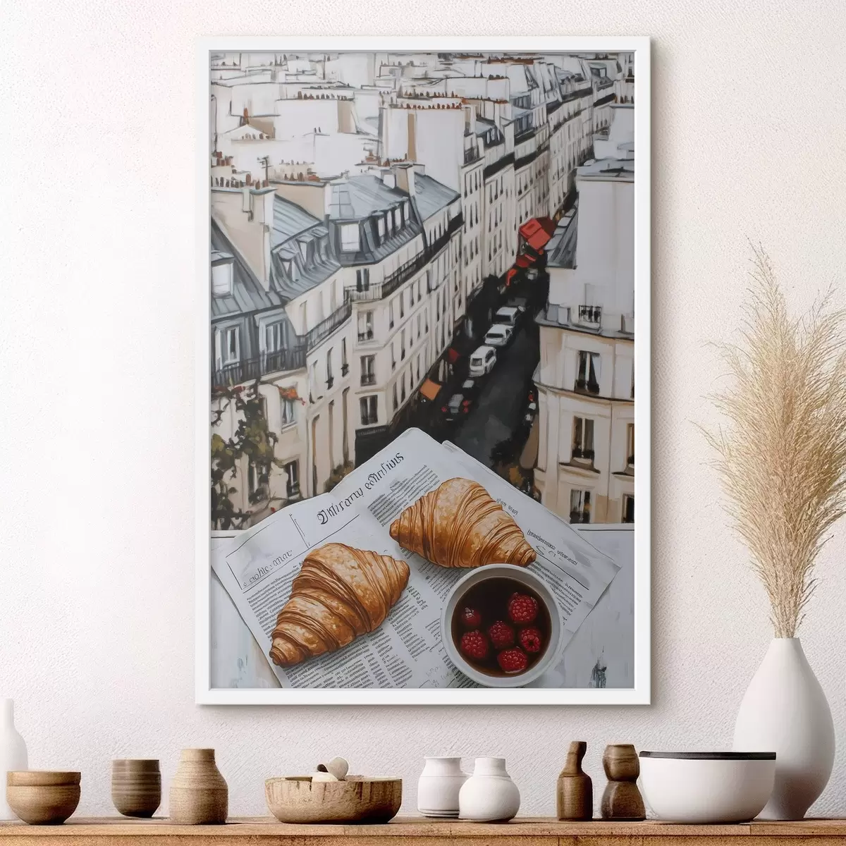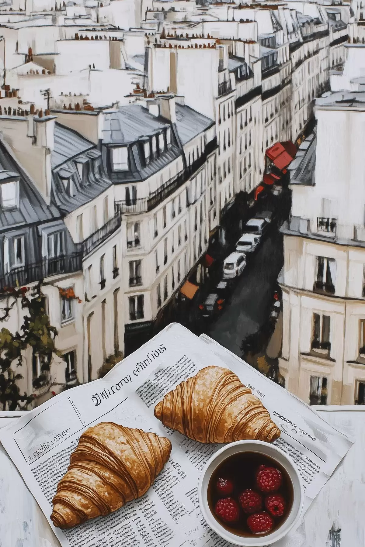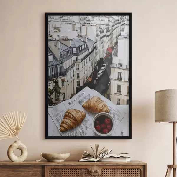 Poster Café de la mañana con croissants, calle de la ciudad, arquitectónico, estilo óleo Nr f43891