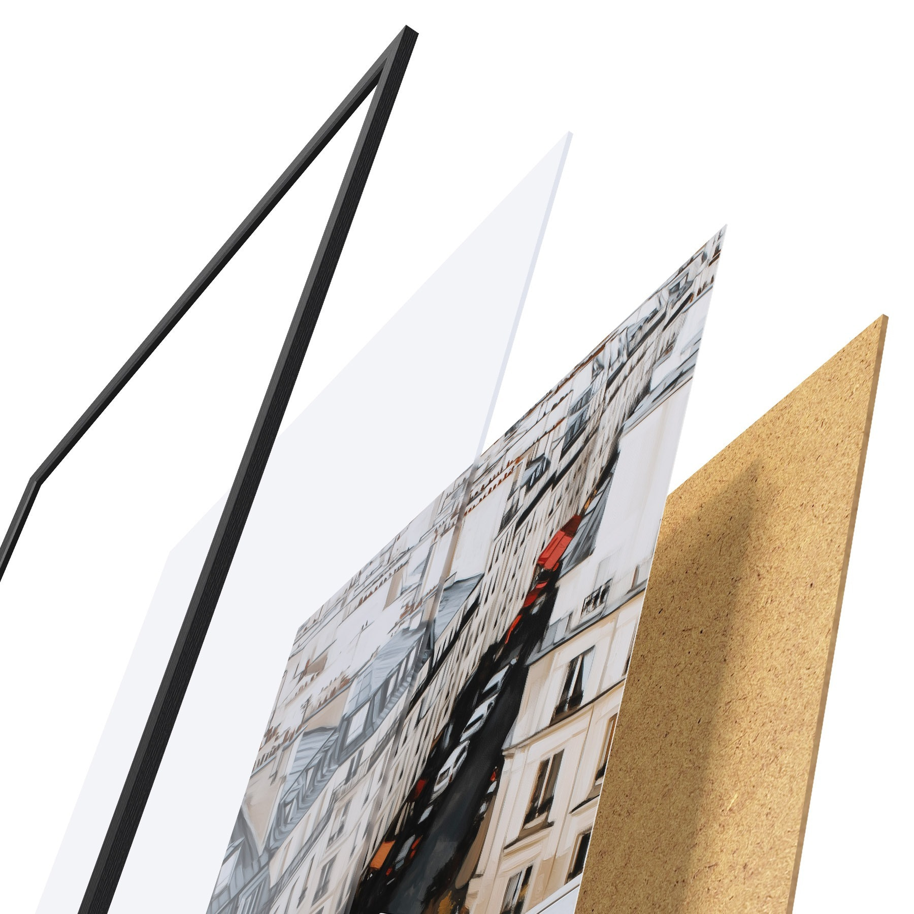 El póster consta de marco, plexiglás, imagen impresa y soporte de aglomerado. El póster puede colgarse inmediatamente en la pared gracias a los soportes de la parte posterior.