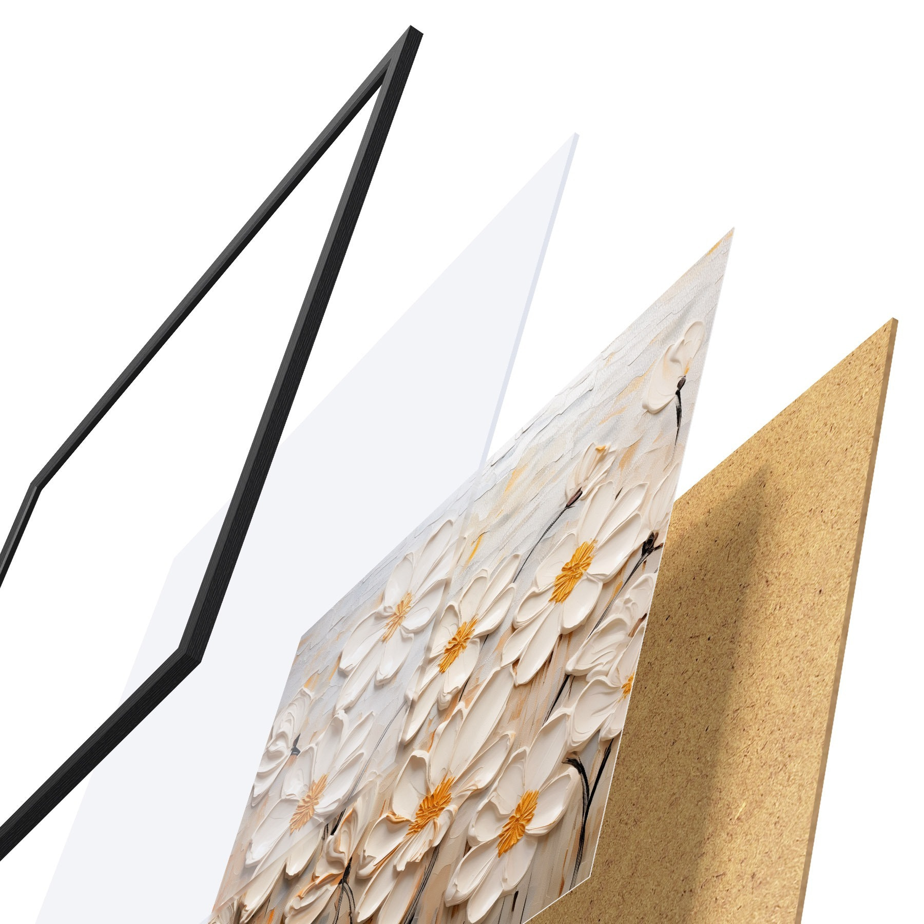 El póster consta de marco, plexiglás, imagen impresa y soporte de aglomerado. El póster puede colgarse inmediatamente en la pared gracias a los soportes de la parte posterior.