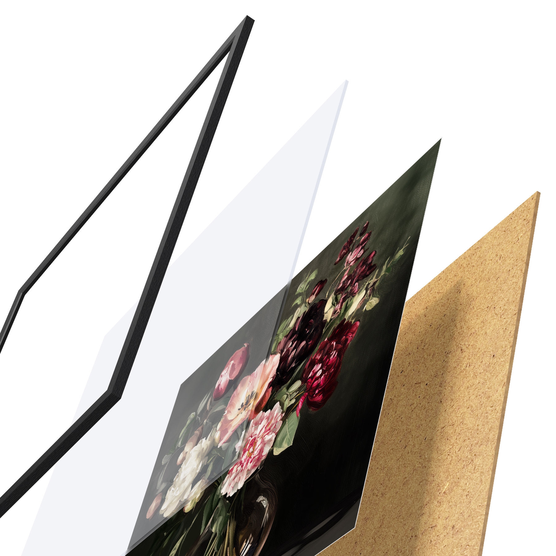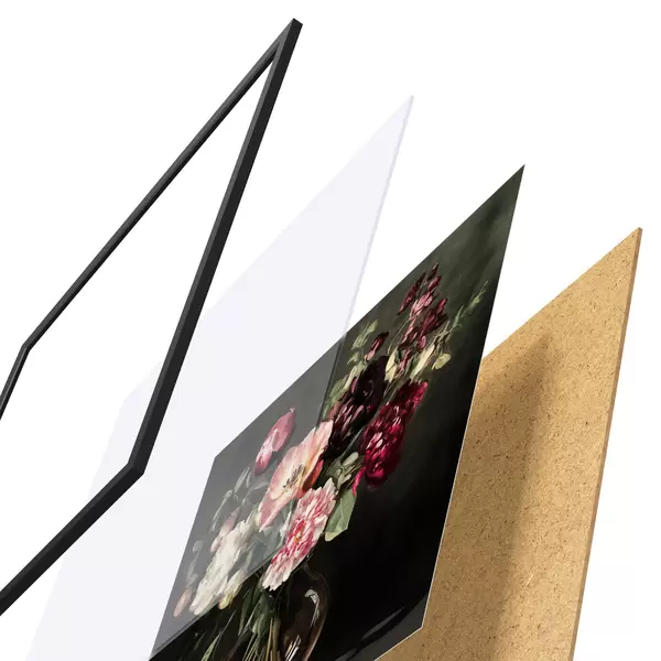 El póster consta de marco, plexiglás, imagen impresa y soporte de aglomerado. El póster puede colgarse inmediatamente en la pared gracias a los soportes de la parte posterior.