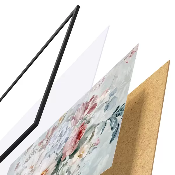 El póster consta de marco, plexiglás, imagen impresa y soporte de aglomerado. El póster puede colgarse inmediatamente en la pared gracias a los soportes de la parte posterior.
