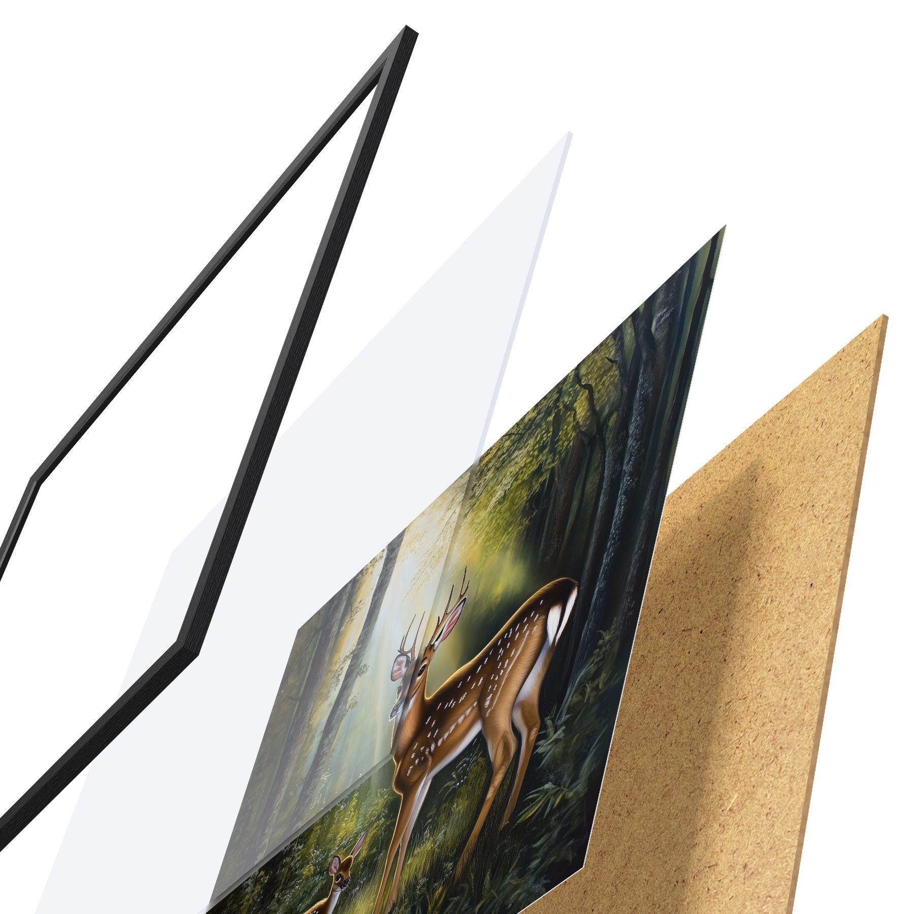 El póster consta de marco, plexiglás, imagen impresa y soporte de aglomerado. El póster puede colgarse inmediatamente en la pared gracias a los soportes de la parte posterior.