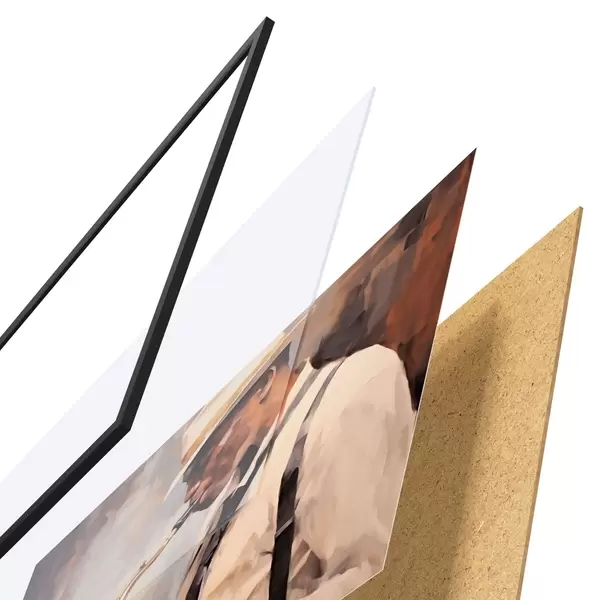 El póster consta de marco, plexiglás, imagen impresa y soporte de aglomerado. El póster puede colgarse inmediatamente en la pared gracias a los soportes de la parte posterior.