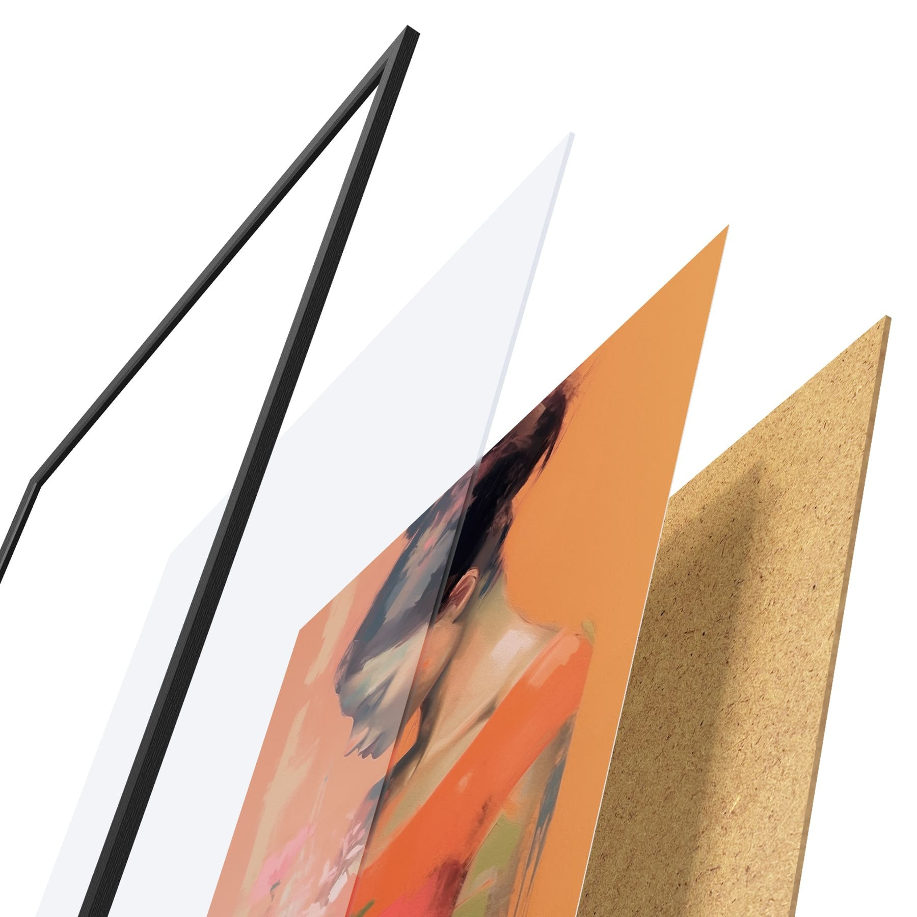 El póster consta de marco, plexiglás, imagen impresa y soporte de aglomerado. El póster puede colgarse inmediatamente en la pared gracias a los soportes de la parte posterior.