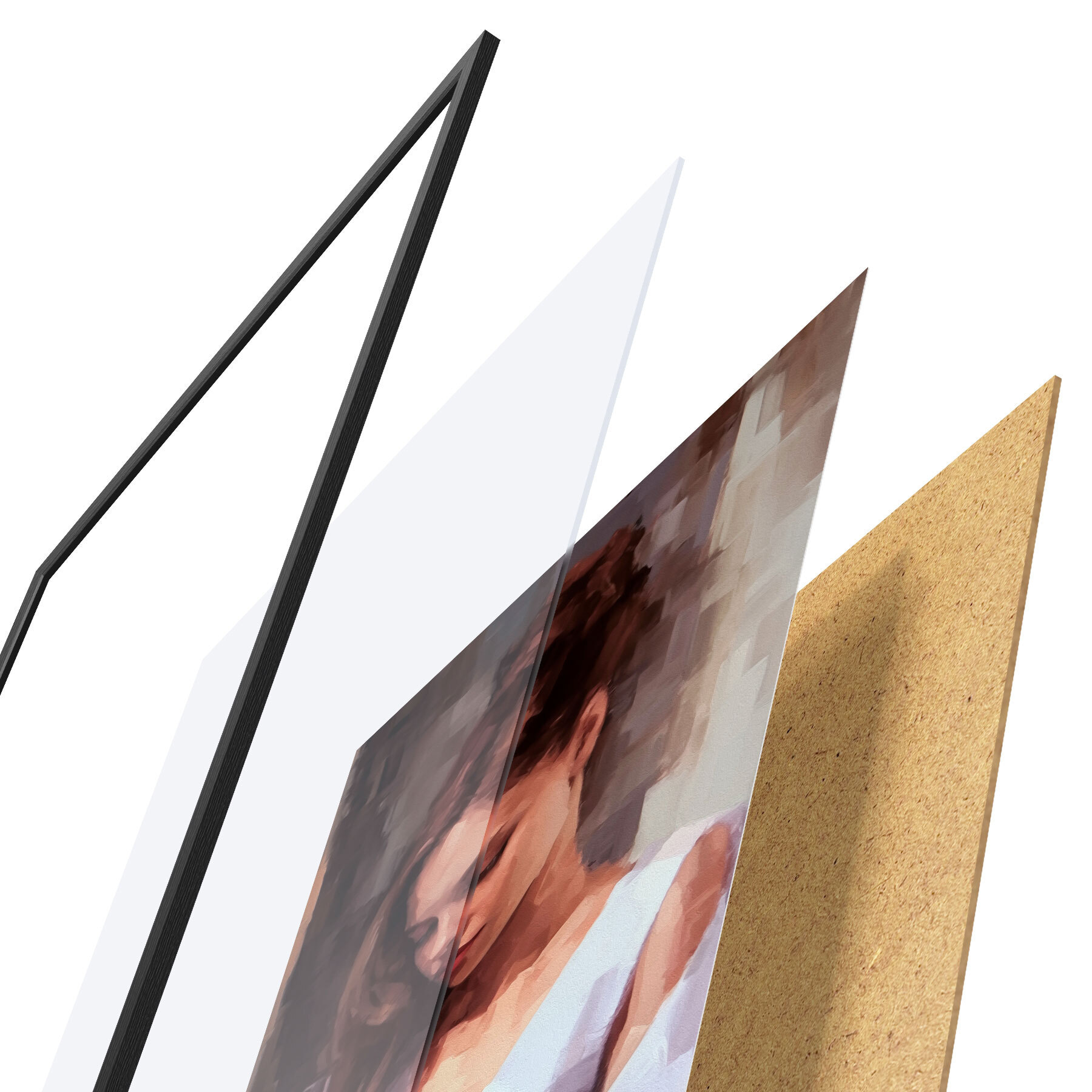 El póster consta de marco, plexiglás, imagen impresa y soporte de aglomerado. El póster puede colgarse inmediatamente en la pared gracias a los soportes de la parte posterior.