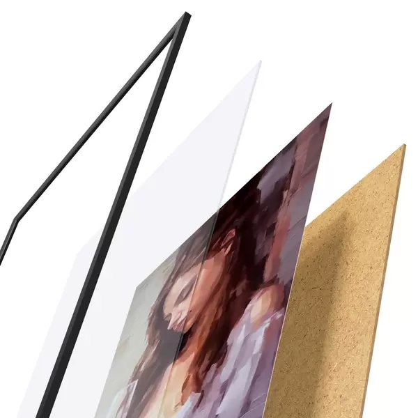 El póster consta de marco, plexiglás, imagen impresa y soporte de aglomerado. El póster puede colgarse inmediatamente en la pared gracias a los soportes de la parte posterior.