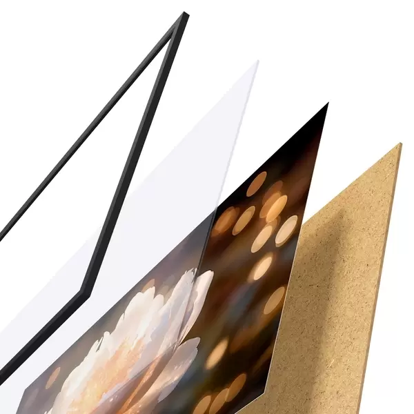 El póster consta de marco, plexiglás, imagen impresa y soporte de aglomerado. El póster puede colgarse inmediatamente en la pared gracias a los soportes de la parte posterior.