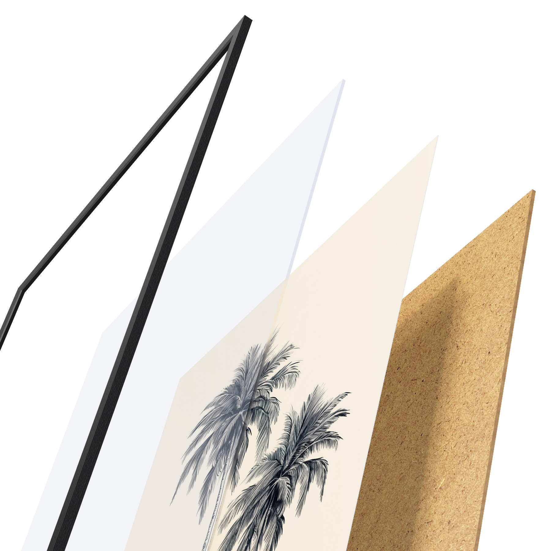 El póster consta de marco, plexiglás, imagen impresa y soporte de aglomerado. El póster puede colgarse inmediatamente en la pared gracias a los soportes de la parte posterior.