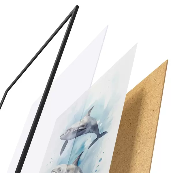 El póster consta de marco, plexiglás, imagen impresa y soporte de aglomerado. El póster puede colgarse inmediatamente en la pared gracias a los soportes de la parte posterior.