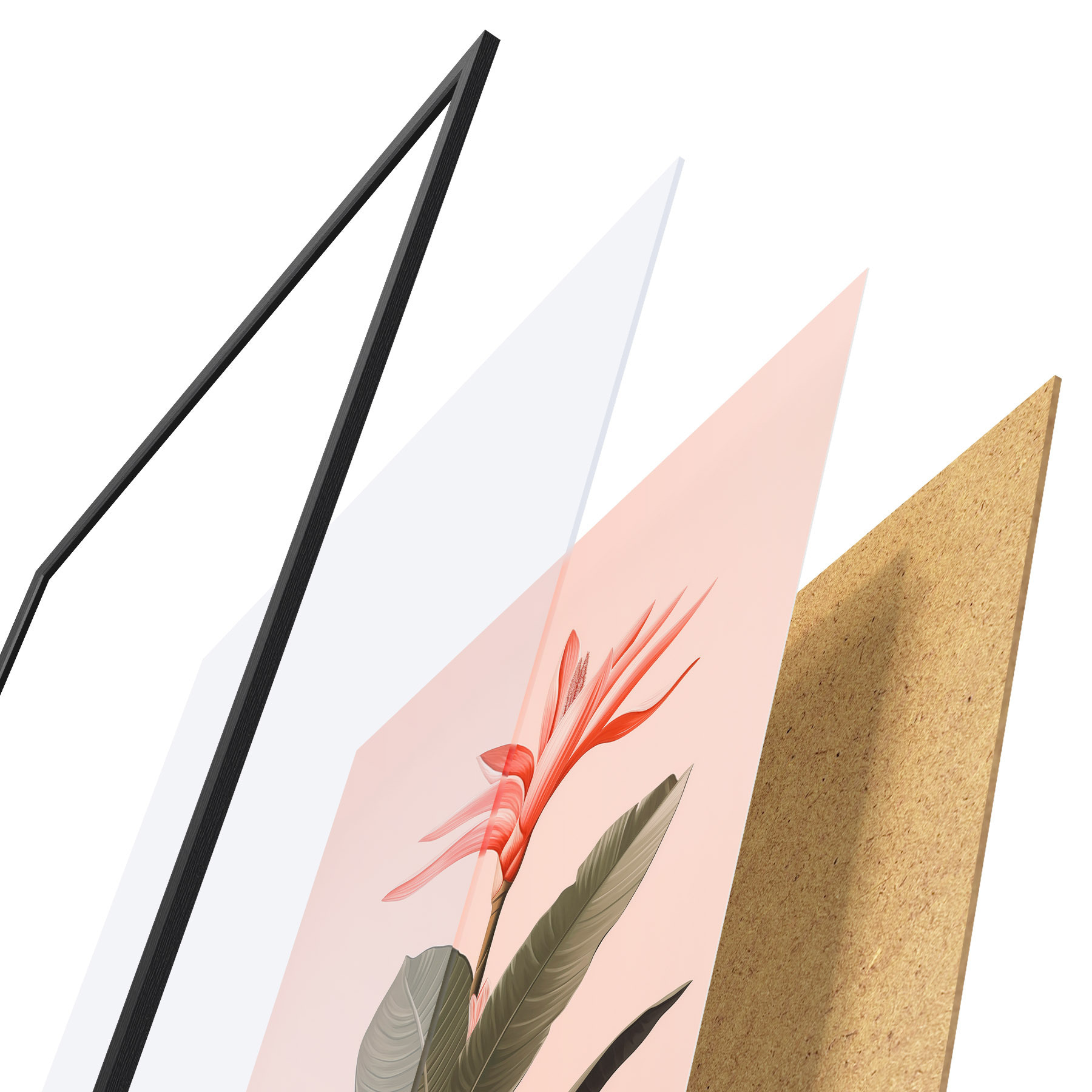 El póster consta de marco, plexiglás, imagen impresa y soporte de aglomerado. El póster puede colgarse inmediatamente en la pared gracias a los soportes de la parte posterior.