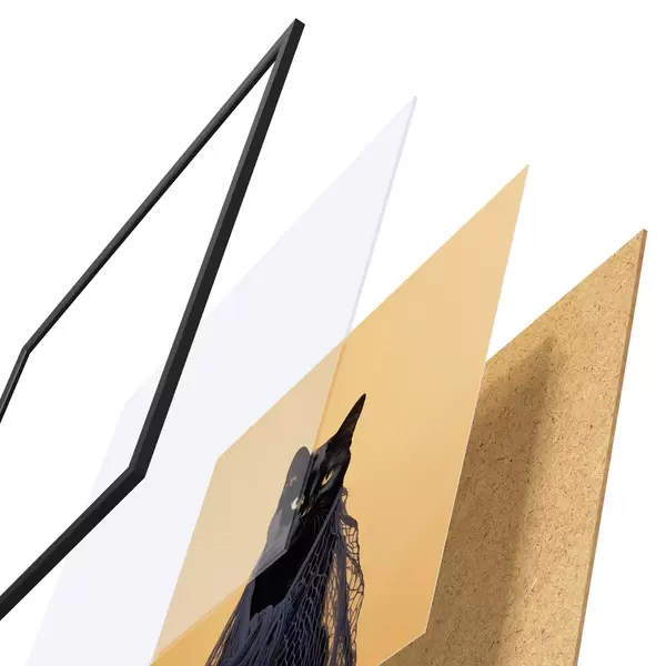 El póster consta de marco, plexiglás, imagen impresa y soporte de aglomerado. El póster puede colgarse inmediatamente en la pared gracias a los soportes de la parte posterior.