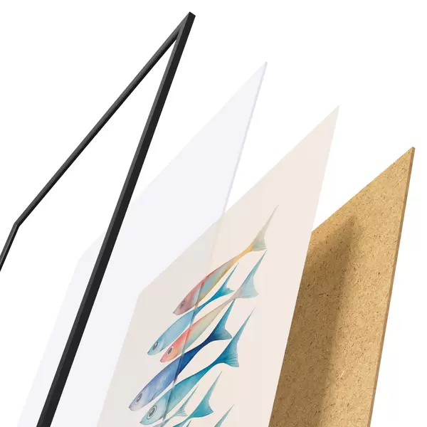 El póster consta de marco, plexiglás, imagen impresa y soporte de aglomerado. El póster puede colgarse inmediatamente en la pared gracias a los soportes de la parte posterior.