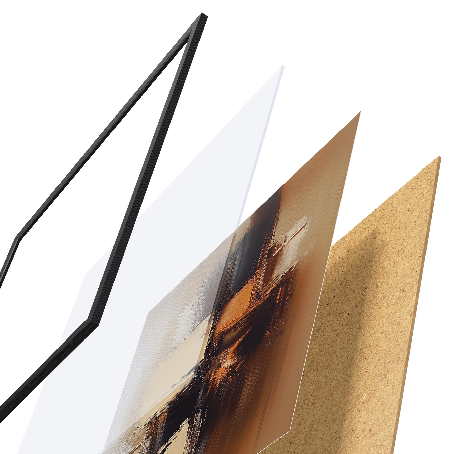 El póster consta de marco, plexiglás, imagen impresa y soporte de aglomerado. El póster puede colgarse inmediatamente en la pared gracias a los soportes de la parte posterior.