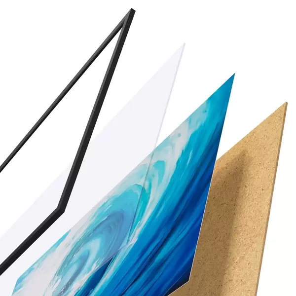 El póster consta de marco, plexiglás, imagen impresa y soporte de aglomerado. El póster puede colgarse inmediatamente en la pared gracias a los soportes de la parte posterior.