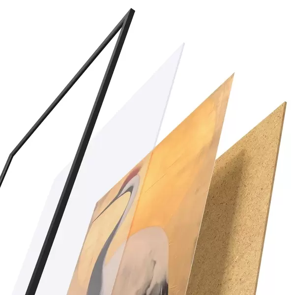 El póster consta de marco, plexiglás, imagen impresa y soporte de aglomerado. El póster puede colgarse inmediatamente en la pared gracias a los soportes de la parte posterior.