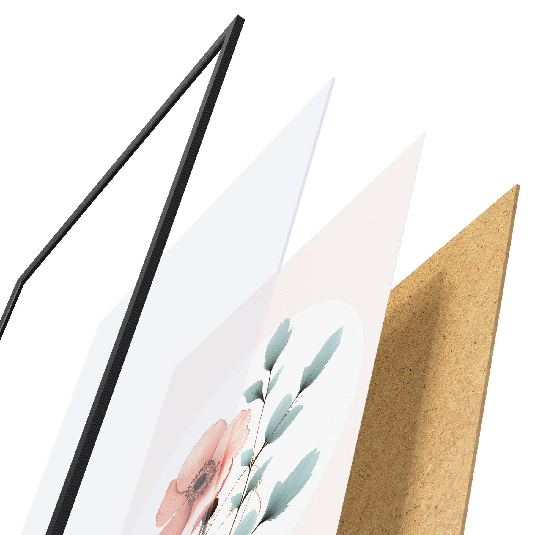 El póster consta de marco, plexiglás, imagen impresa y soporte de aglomerado. El póster puede colgarse inmediatamente en la pared gracias a los soportes de la parte posterior.