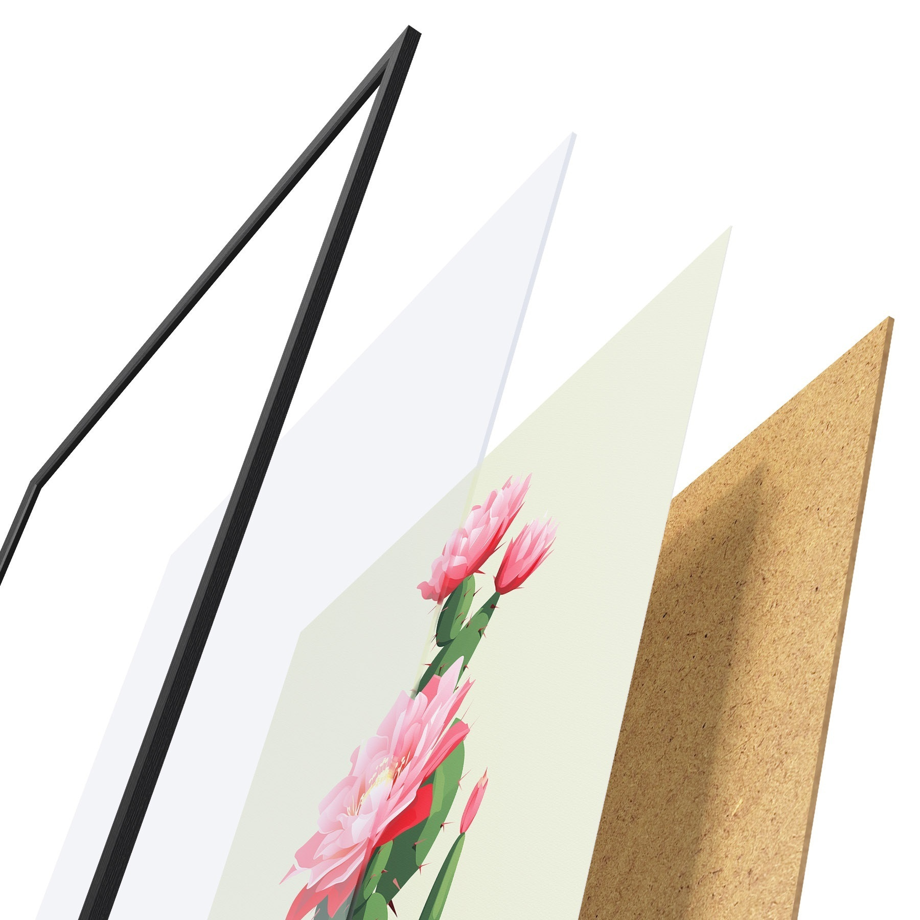 El póster consta de marco, plexiglás, imagen impresa y soporte de aglomerado. El póster puede colgarse inmediatamente en la pared gracias a los soportes de la parte posterior.