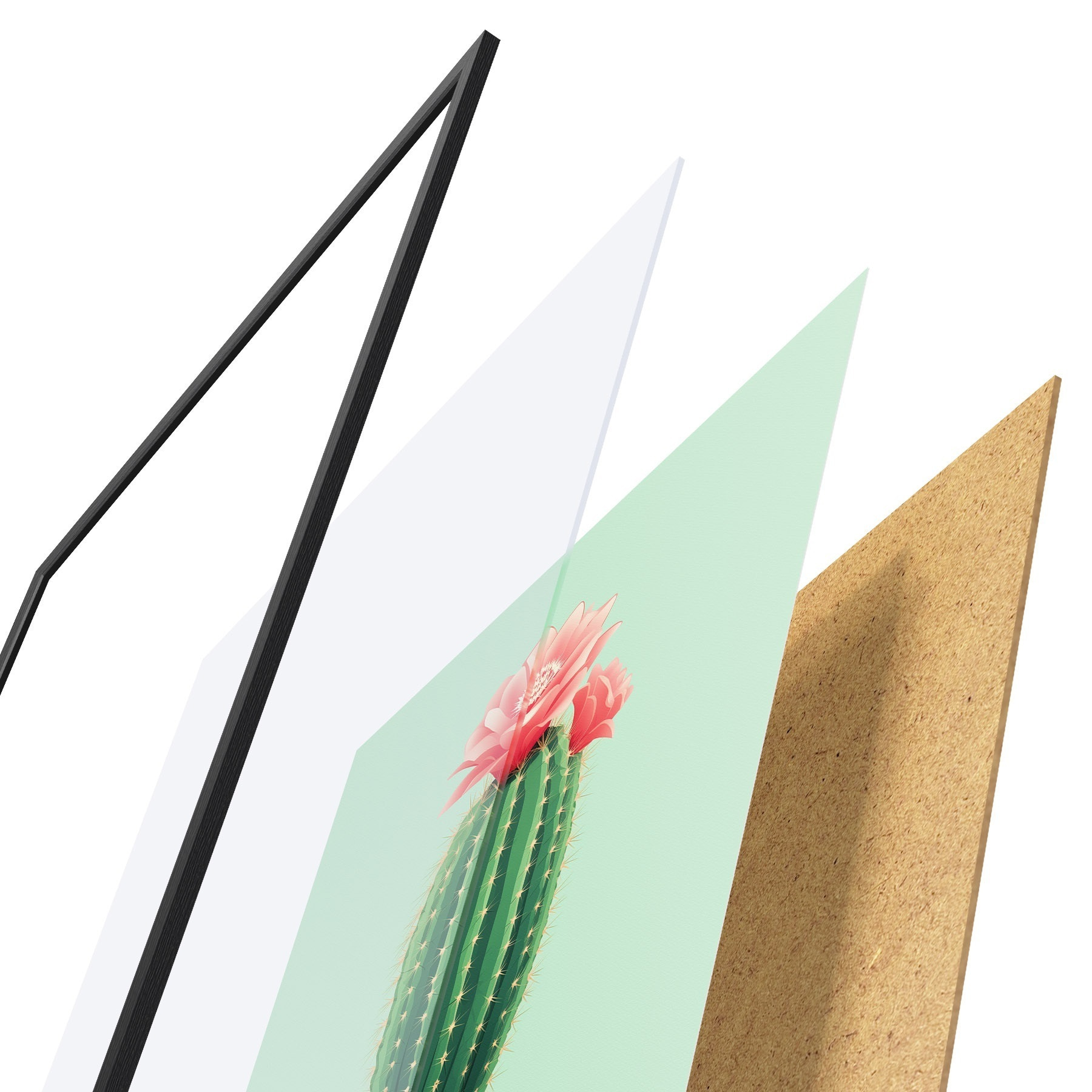 El póster consta de marco, plexiglás, imagen impresa y soporte de aglomerado. El póster puede colgarse inmediatamente en la pared gracias a los soportes de la parte posterior.
