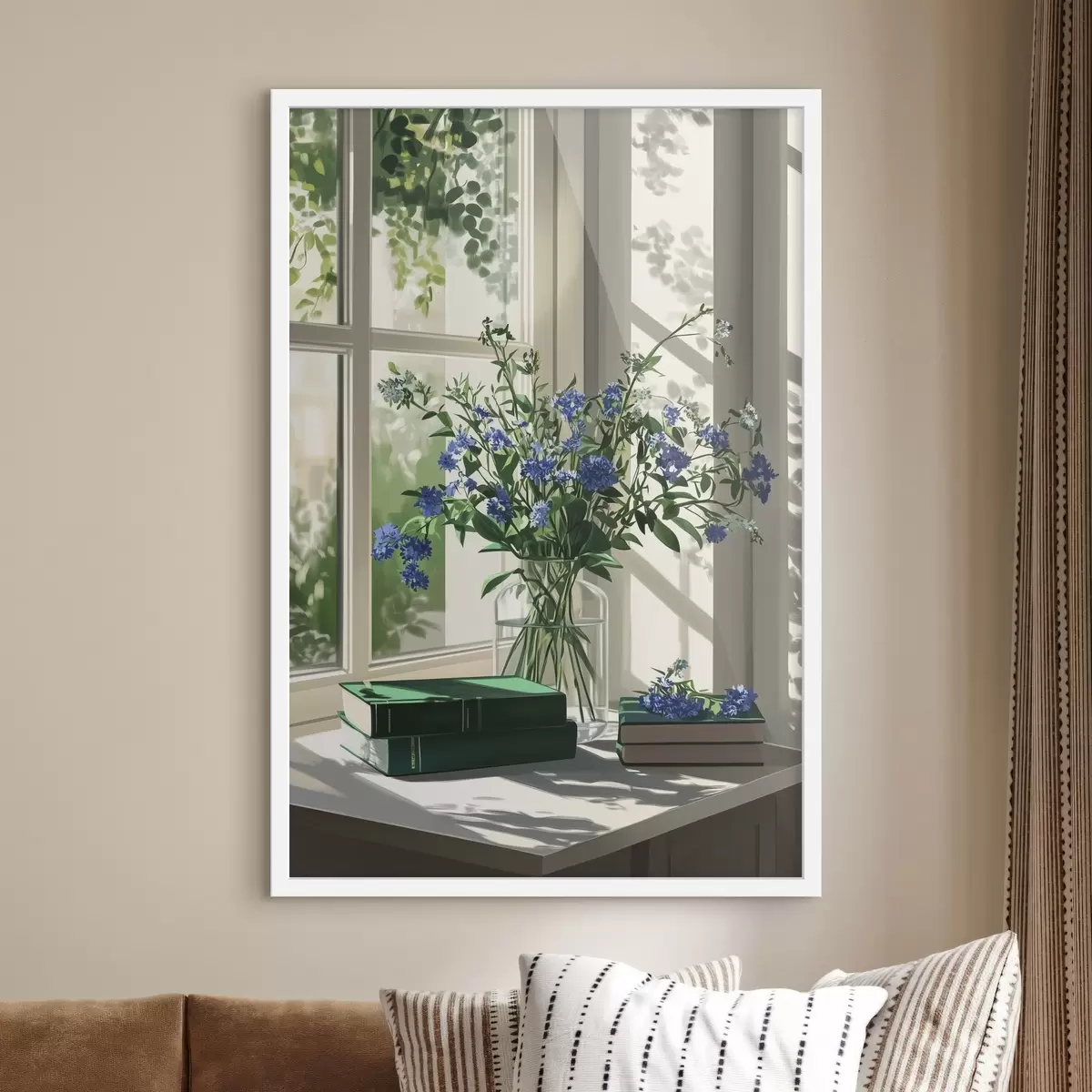 Poster Libros y flores moradas en el jarrón del alféizar, vegetación Nr f44008