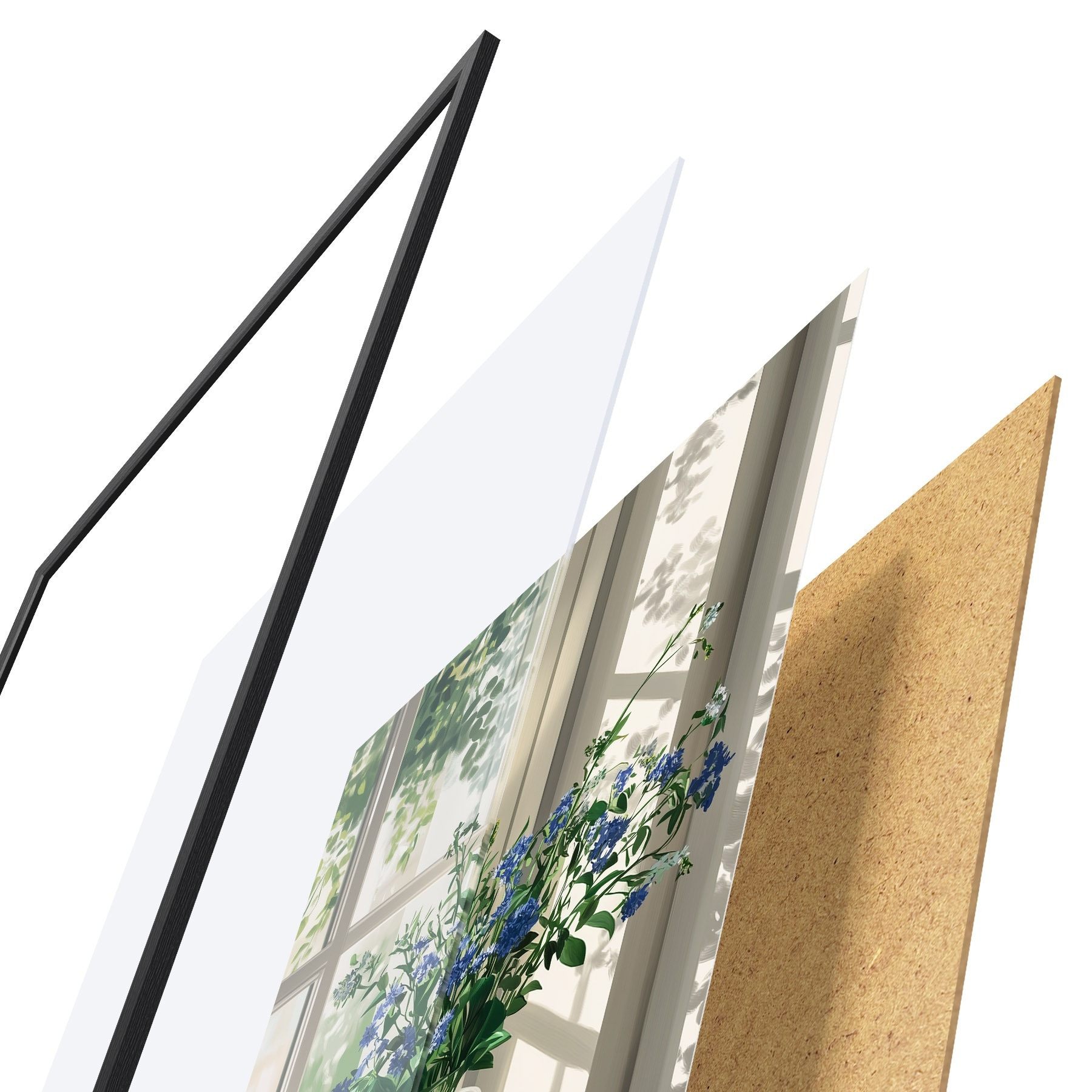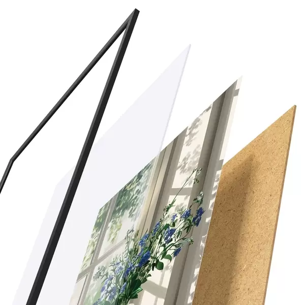 El póster consta de marco, plexiglás, imagen impresa y soporte de aglomerado. El póster puede colgarse inmediatamente en la pared gracias a los soportes de la parte posterior.
