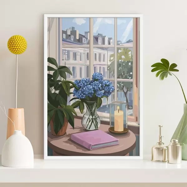 Poster Hortensias en el jarrón, vista a la ventana, vela, hogar acogedor Nr f44009