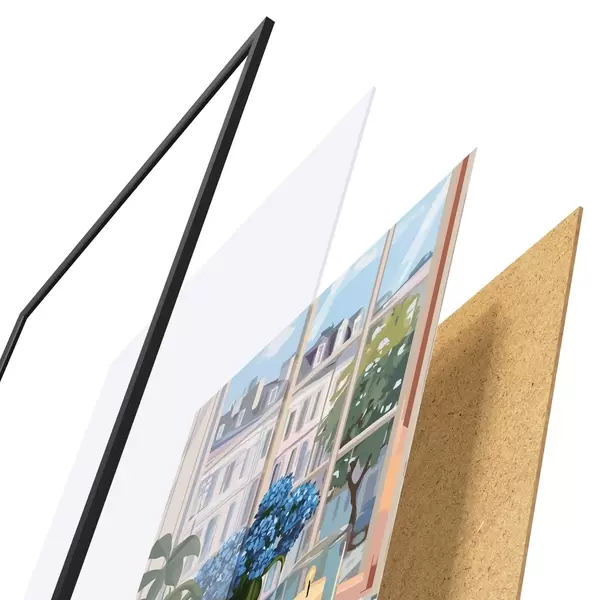 El póster consta de marco, plexiglás, imagen impresa y soporte de aglomerado. El póster puede colgarse inmediatamente en la pared gracias a los soportes de la parte posterior.