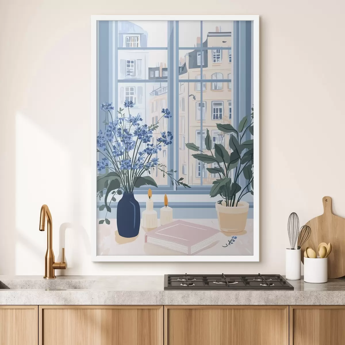Poster Acogedora casa con flores y vista a la ventana, arquitectura, colores azules Nr f44010