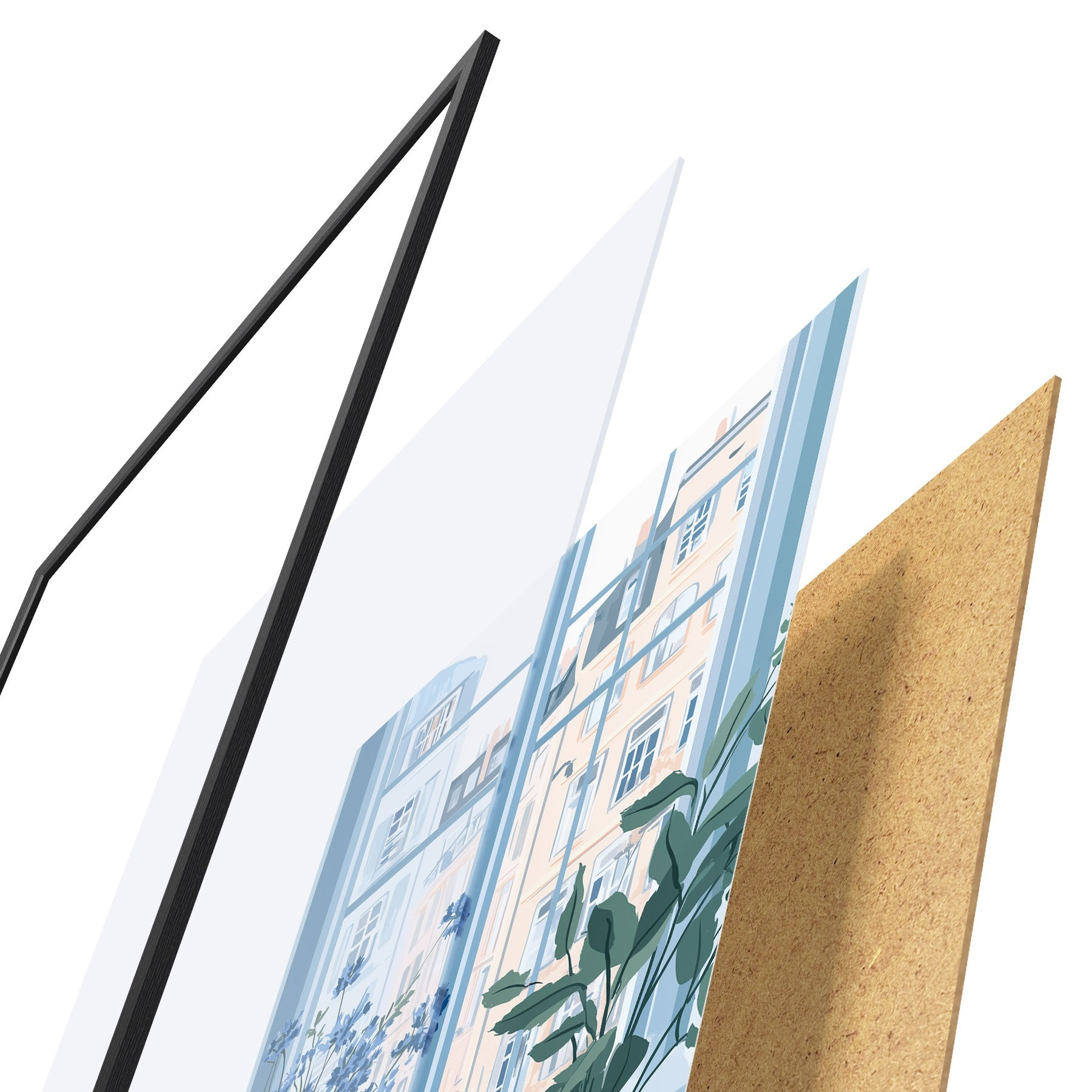 El póster consta de marco, plexiglás, imagen impresa y soporte de aglomerado. El póster puede colgarse inmediatamente en la pared gracias a los soportes de la parte posterior.