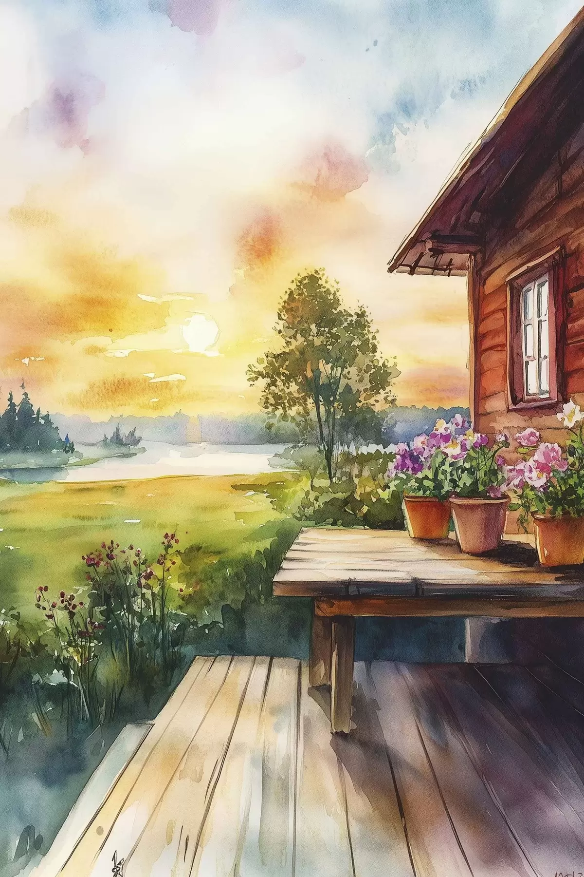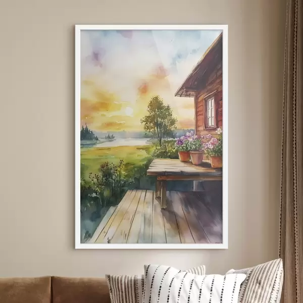 Poster Colores del atardecer, granja, estilo acuarela, rústico, flores de verano Nr f44017