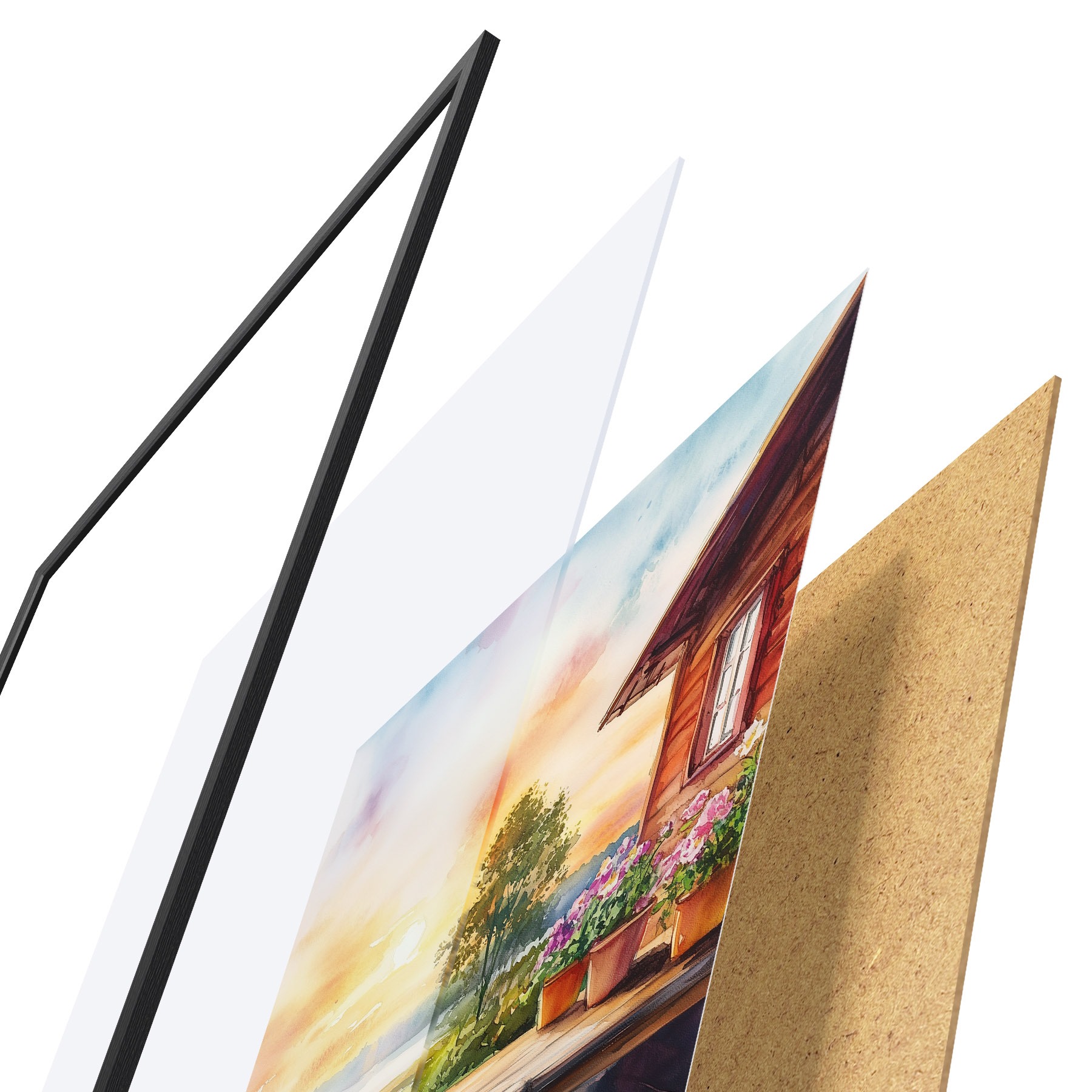 El póster consta de marco, plexiglás, imagen impresa y soporte de aglomerado. El póster puede colgarse inmediatamente en la pared gracias a los soportes de la parte posterior.