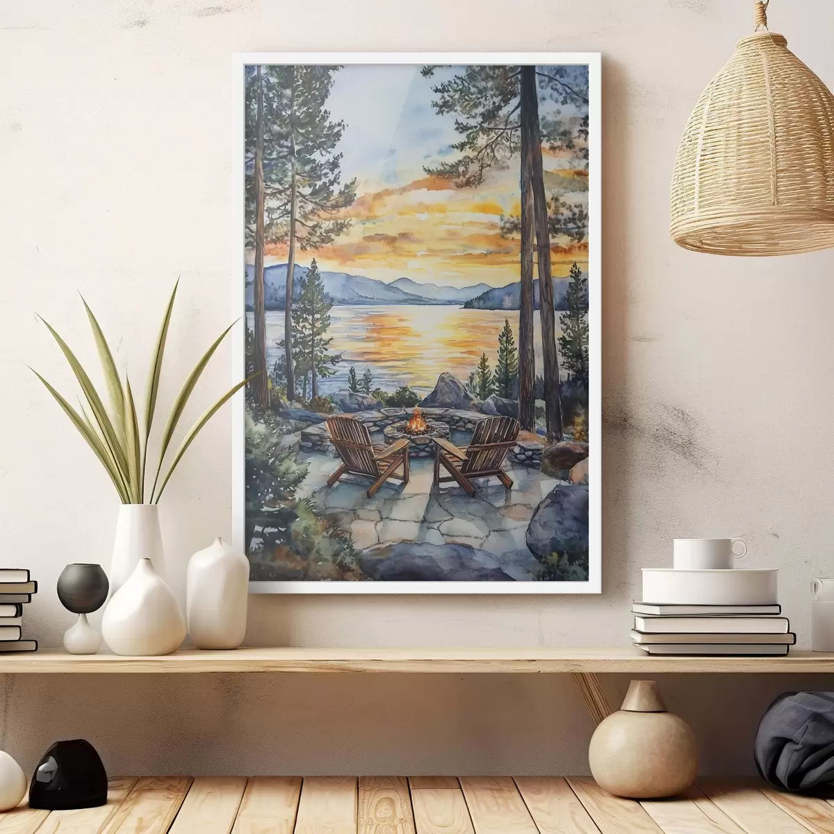 Poster Lago con montañas en la puesta de sol, viajar, acogedora chimenea, acuarela Nr f44018