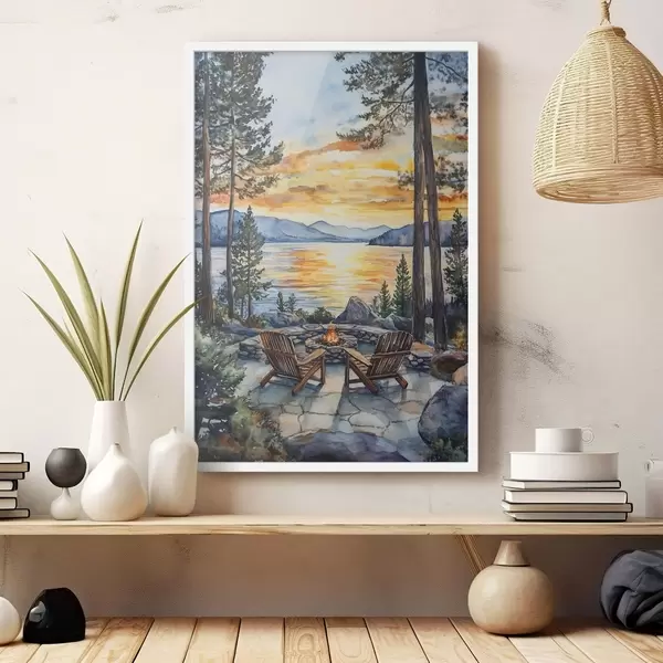 Poster Lago con montañas en la puesta de sol, viajar, acogedora chimenea, acuarela f44018