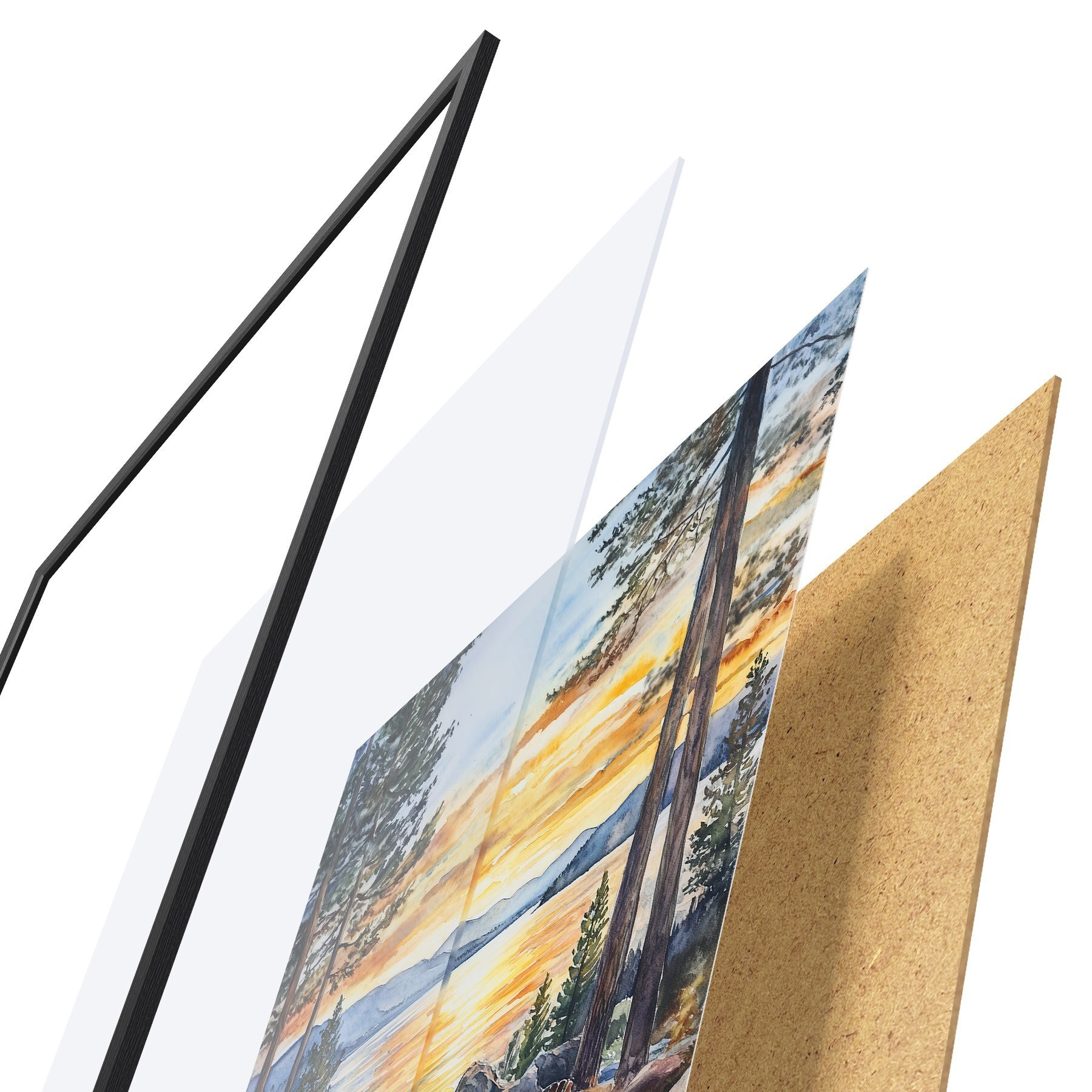 El póster consta de marco, plexiglás, imagen impresa y soporte de aglomerado. El póster puede colgarse inmediatamente en la pared gracias a los soportes de la parte posterior.