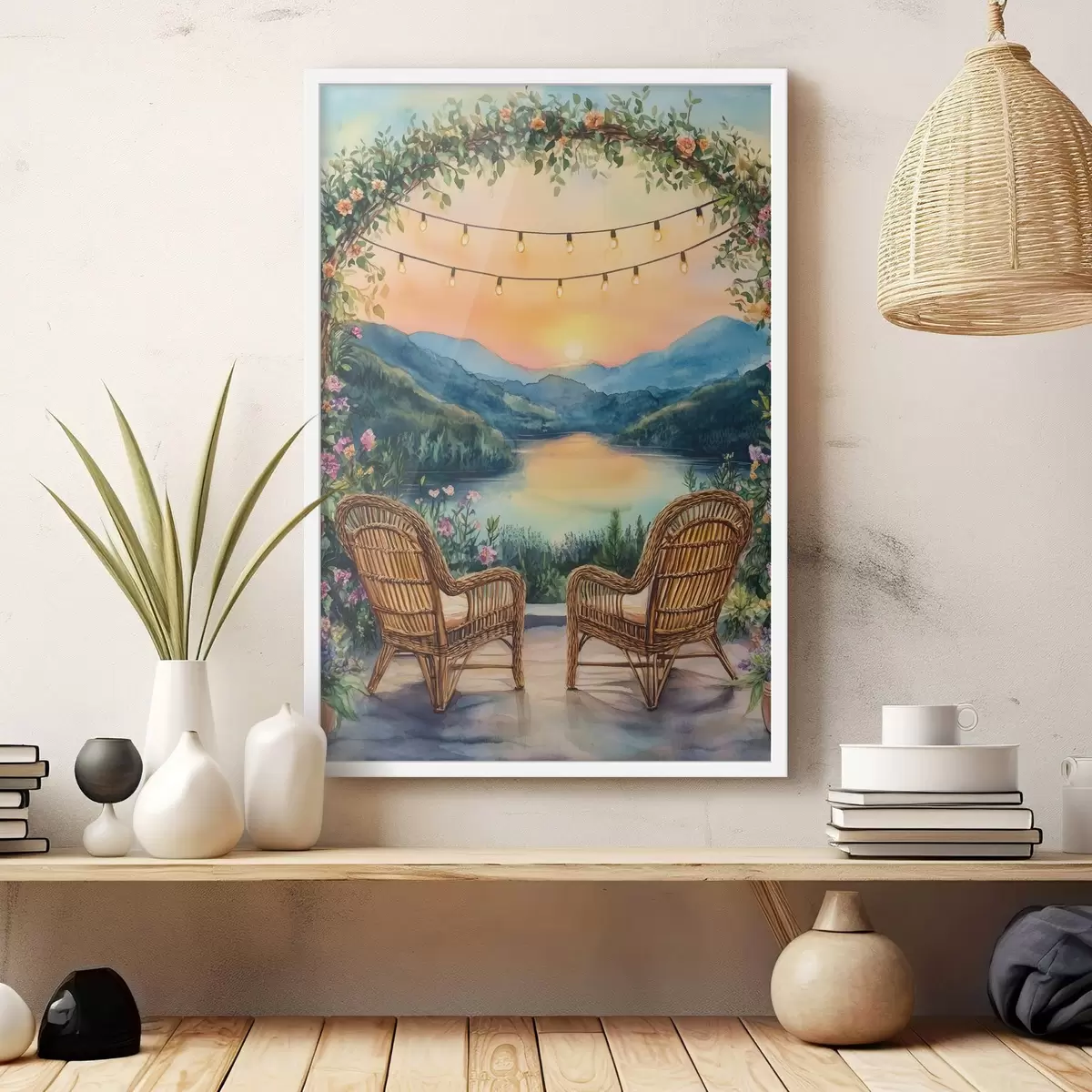 Poster Sillas de mimbre en la puesta de sol, paisaje de montaña, estilo boho f44020