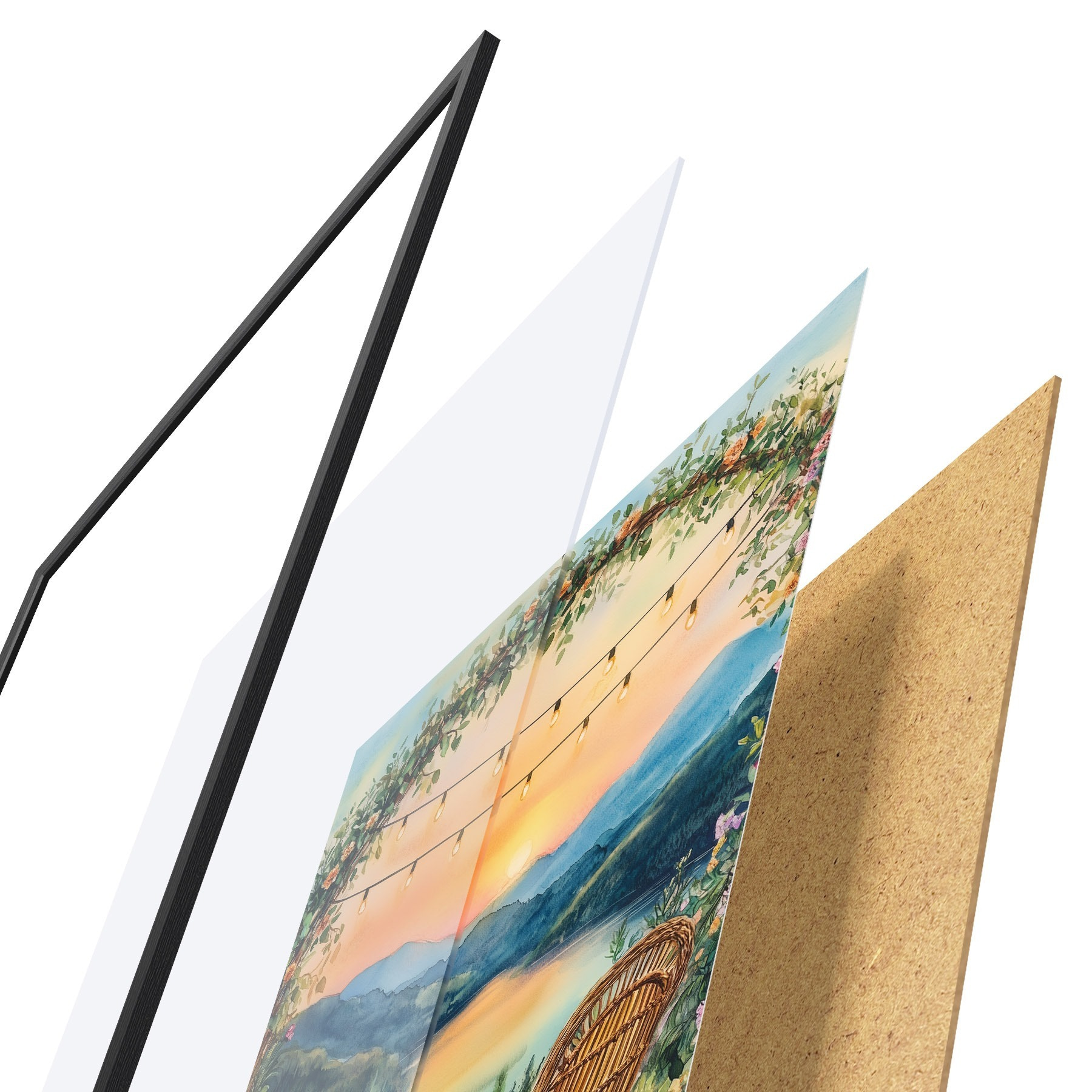 El póster consta de marco, plexiglás, imagen impresa y soporte de aglomerado. El póster puede colgarse inmediatamente en la pared gracias a los soportes de la parte posterior.
